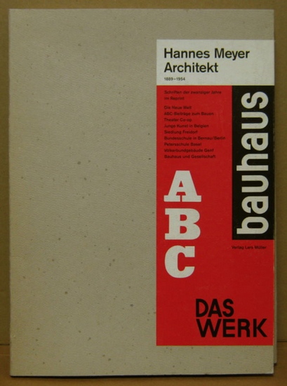 Hannes Meyer, Architekt (1889-1954): ABC Bauhaus. Das Werk. Schriften der zwanziger Jahre im Reprint. Baden (Schweiz), Verlag Lars Müller, 1990. 4°; 8 Hefte in Mappe, mit Abbildungen;. Mappe gering lagerspurig und an den Ecken bestoßen, sonst guter Zustand vorliegende Reprintmappe ist eine Zusammenstellung von sechs Meyer-Texten "Siedlung Freidorf" (1919-1921). "Theater Co-op" (1924). "Junge Kunst in Belgien" (1925), "Die neue Welt" (1926); "Die neue Welt und bauen" (1928). "ABC - Beiträge zum Bauen" (1926, erstmals erschienen in Serie 2, Heft 2). Zu diesen Texten gibt es noch eine vom Hrsg. getroffene Auswahl aus der Zeitschrift "Bauhaus" ("die Petersschule Basel", ein Völkerbundgebäude für Genf", "das Propagandatheater co-op", "bauen", "Bauhaus und Gesellschaft") sowie eine Baudokumentation der ADGB-Bundesschule in Bernau/ Berlin mit einem Text von Adolph Behne. Die Hefte / Blätter sind jeweils in ein Pergamin-Umschlag gefaßt.