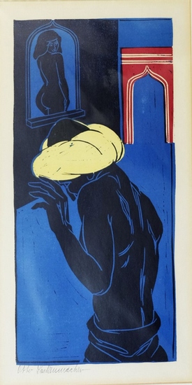 Tadsch el Muluk und Dunja. Farbholzschnitt aus " Tausendundeine Nacht", 1960. 35,5x18,5 cm, auf großem Papier (61x43 cm) *Eins von 100 Exemplaren, rückseitig typographisch bezeichnet. *Handschriftlich signiert.
