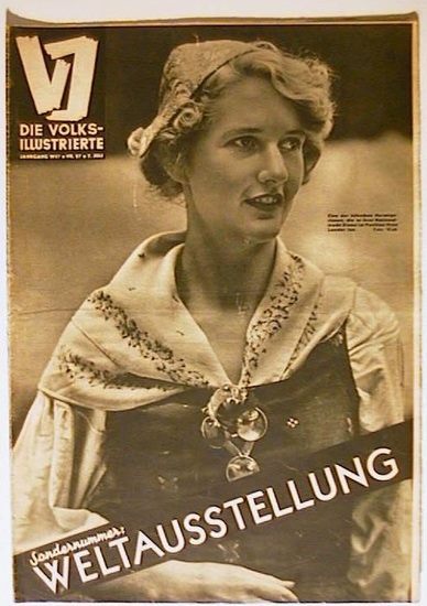 V-I (Volks-Illustrierte) Jahrgang 1937 - Nr. 27 - 7.7.1937. Sondernummer "Weltausstellung". Prag, Jan Burger, 1937. [12] S., mit zahlreichen Abbildungen nach Fotografien. Illustrierter Original-Umschlag, 28 x 38 cm. Am unteren Rand etwas knittrig, die Umrisse der auf der fünften Seite abgebildeten Statue mit weisser Farbe nachgezogen. V-I (Volks-Illustrierte)