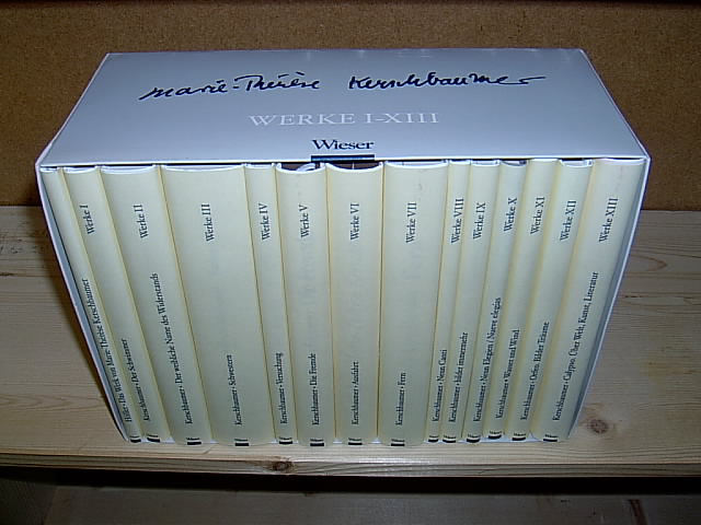 Werke I-XIII. Bd.I: Der Schwimmer. / Bd.II: Der weibliche Name des WIderstands. / Bd.III: Schwestern. / Bd.IV: Versuchung. / Bd.V: Die Fremde. / Bd.VI: Ausfahrt. / Bd.VII: Fern. / Bd.VIII: Neun Canti. / Bd.IX: Bilder immermehr. / Bd.X: Neun Elegien. / Bd.XI: Wasser und Wind. / Bd.XII: Orfeo. Bilder Träume. / Bd.XIII: Calypso. Über Welt, Kunst, Literatur. / Bd. 14: Hans Höller. Das Werk von Marie-Therese Kerschbaumer. Ein Essay. 14 Bände. Wieser, Klagenfurt -2007. 8°. Pappbände mit Schutzumschlag in Kassette,. Kassette leicht berieben, teils etwas knickspurig, Umschläge teils leicht berieben, Einbände minimal berieben, Kapitale von Bd.XII etwas bestoßen, Rücken von Bd.XIII leicht verblaßt, sonst ordentlicher Zustand.