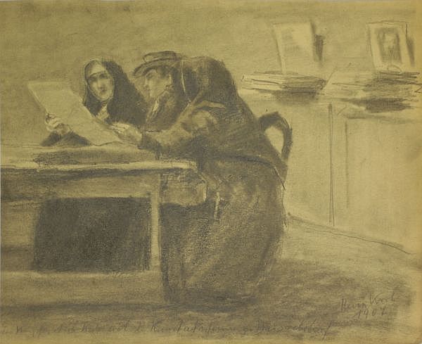 Im Kupferstich Kabinet der Kunstakademie zu Düsseldorf. - [Kreidezeichnung]. - [Köln], 1907. Zeichnung, Blattmaß: 17,5 x 21,5 cm (quer). Die Zeichnung des Kölner Malers Heinz Kroh (1881-1972) ist am unteren Bildrand eigenhändig in Bleistift signiert, datiert und betitelt. Auf der Rückseite des Blattes sind zwei kleine Skizzen und Notizen in zartem Bleistift. Die Zeichnung aus dem Frühwerk Krohs ist sehr schön komponiert und besticht durch ihre Kontrastwirkung. - Minimal angerändert, sonst schönes Exemplar.