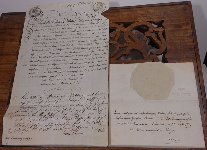 Interessanter Brief im Namen von König Friedrich II. von Preußen, signiert vom Großkanzler Johann Heinrich von Carmer (1720-1801). Beiliegend der originale Umschlag. Berlin 1783. Gerichtet an das Berliner Hof- und Kammergericht, die Einsetzung des Justizmanns Liezmann (wohl = Litzmann) aus Dannenwalde als Bürgermeister von Pritzwalk betreffend, der die Stelle des Bürgermeisters Albrecht antritt. -- Deutsche Handschrift auf Papier, datiert Berlin, den 11. Oktober 1783. Darunter Notizen der empfangenden Behörde vom 1. November 1783. Geschrieben auf Stempelpapier. -- Umfang: etwas über eine Seite beschrieben (34,8 x 20,8 cm); der Umschlag im Format 8,9 x 17,2 cm (mit dem papiergedeckten königlichen Siegel). -- Zustand: Papier fleckig, insgesamt gut. Über Johann Heinrich von Carmer (Quelle: wikipedia): Johann Heinrich Casimir Graf von Carmer (* 29. Dezember 1720 in Kreuznach, Geburtsjahr auch 1721; gest. 23. Mai 1801 in Rützen, Schlesien) war ein preußischer Justizreformer. Herkunft: Seine Eltern waren Johann Wilhelm de Carmer und dessen Ehefrau Ida Maria Rademacher. Sein Vater war kurpfälzischer Obereinnehmer und Kammerrat ging dann in preußische Dienste wo er Hofrat wurde. -- Leben: Nach dem Besuch des Reformierten Gymnasiums Kreuznach studierte Carmer Rechtswissenschaften in Gießen, Jena und Halle. Danach arbeitete er unter anderem am Reichskammergericht. 1749 wurde er als Referendar am Kammergericht in preußischen Dienst übernommen. 1751 bestellte ihn Großkanzler Samuel von Cocceji zum Regierungsrat in Oppeln. Später wurde er zunächst Direktor, dann Präsident der Oberamtsregierung in Breslau. Indem er 1768 zum Chefpräsidenten sämtlicher Oberamtsregierungen in Schlesien wurde, erhielt er den Titel des schlesischen Justizministers. Als 1779 im Zuge der Müller-Arnold-Affäre der amtierende Großkanzler Maximilian von Fürst und Kupferberg vom preußischen König Friedrich II. entlassen wurde, machte der König Carmer zu dessen Nachfolger. Als Großkanzler setzte Carmer mit Carl Gottlieb Svarez umfangreiche Reformen in der preußischen Justiz durch, teilweise auch gegen den Widerstand der Berliner Justizkreise. Schon während seiner Zeit in Schlesien stand er in Fragen der Justiz- und Prozessrechtsreform in Kontakt mit dem König, der damit den eigentlich hierfür zuständigen Großkanzler Fürst überging. Während dieser zur Erfüllung der Reformwünsche Friedrichs behutsame Anpassungen und vorsichtige Umgestaltung propagierte, stand Carmer mit seiner zupackenden und energischen Art, ganz im Sinne des Königs, eher für umfassende Reformen und versprach dem Monarchen Abhilfe. Nachdem er als Großkanzler und Erster Minister des Justizdepartements eingesetzt war, konnte er die Umsetzung seiner Vorstellungen in Angriff nehmen. Ausschlaggebend für die nun folgende Arbeit war eine inhaltlich auf ihn zurückgehende Kabinettsorder Friedrichs vom 14. April 1780. Hierin wurden die Grundzüge einer Reform des gesamten Rechts, insbesondere des Prozessrechts, angedeutet. In Ausführung dieser Order schuf Carmer mit seinen Mitarbeitern das Corpus Juris Fridericianum, das vom 1794 unter Friedrich Wilhelm II. verabschiedeten Allgemeinen Landrecht für die Preußischen Staaten abgelöst wurde. Damit waren Gesetze entstanden, die auf Jahrzehnte hinaus das preußische Rechtsleben prägen sollten. Carmer verfasste nicht nur Teile dieser Gesetze selbst, sondern sorgte auch für die nötige Unterstützung der Projekte durch den König und für deren Verteidigung gegen auftretende Widerstände. Für seine Leistungen bei der Vereinheitlichung und Modernisierung des preußischen Rechts wurde er am 18. Januar 1788 von König Friedrich Wilhelm II. mit dem Schwarzen Adlerorden ausgezeichnet. Seit 1789 war er Ehrenmitglied der Preußischen Akademie der Wissenschaften. Für die ehemalige Berliner Siegesallee schuf der Bildhauer Adolf Brütt in der Denkmalgruppe 29 eine Büste von Carmers, enthüllt am 22. März 1900. Die Büste war als Nebenbüste dem zentralen Standbild für Friedrich Wilhelm II. zugeordnet. Von Carmer ist in hoheitsvoller Haltung als Repräsentant von Recht und Gesetz dargestellt. Die Büste ist, allerdings ohne Kopf, erhalten und ruht zusammen mit weiteren Siegesalleefiguren seit Mai 2009 in der Zitadelle Spandau. Nach Johann Heinrich von Carmer ist in Berlin-Charlottenburg seit 1892 die Carmerstraße benannt. Bruno Frank porträtierte Carmer literarisch in seiner Novelle Der Großkanzler im Zyklus Tage des Königs. Familie: Er heiratete 1762 auf Rützen Wilhelmine Friederike von (1733-1778), eine Tochter des Reichshofrats und Oberamtsregierungspräsidenten in Glogau Freiherr Hans Friedrich von Roth und Rützen. Das Paar hatte zwei Söhne.