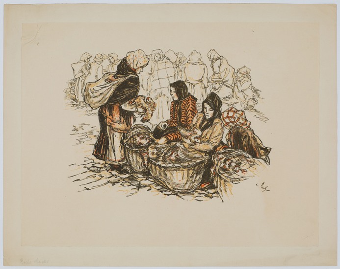 Markt. _. Farblithographie, auf chamoisfarbenem Japan. Darstellungsgröße 26:36 cm, Blattgröße 38:49,3 cm. ? Auf Untersatz montiert, in den oberen Ecken leicht wellig. Vielfältig war Buhes Schaffen auf dem Gebiet der Gebrauchsgrafik, begünstigt durch eine Lithographen-Lehre sowie dem Studium bei Emil Orlik (1870-1932) in Berlin. Er entwarf unter anderem Plakate, Prospekte, Bucheinbände, Notgeld, Briefmarken, Kalender, schuf Illustrationen und entwickelte sogar eine eigene Schrift, die Buhe-Fraktur. Hohes Können und der Facettenreichtum seines Schaffens führten zu seiner Berufung zum Professor für angewandte Grafik an der Akademie für graphische Künste in Leipzig. Diese Professur hatte er von 1920 bis 1947 inne. 1921 wurde er von Erich Gruner, dem künstlerischen Beirat des Leipziger Messeamtes, zusammen mit Georg Baus und Walter Zeising zu einem der ersten Ausstellungsgraphiker der Leipziger Messe berufen.