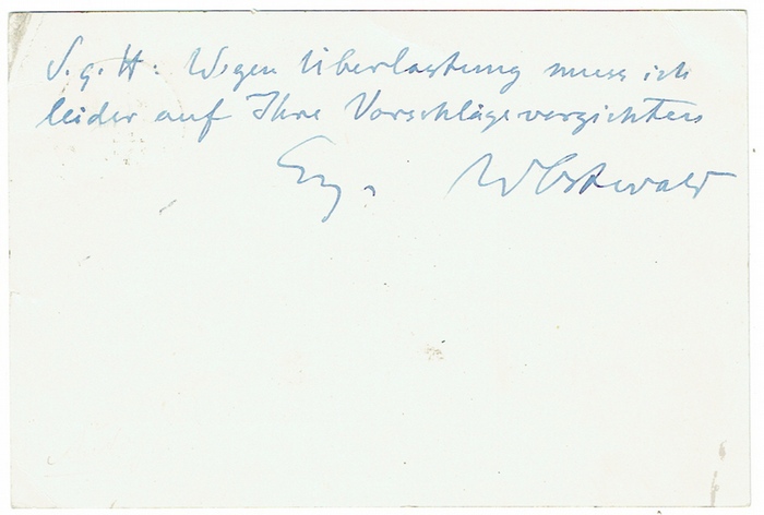 Eigenhändige Postkarte mit Unterschrift. Groß-Bothen, 1. IX. 1924. Quer-8vo. 1/2 p. An die Treptower Sternwarte. Schmettert in an Unhöflichkeit grenzender Knappheit gemachte Vorschläge ab. ?Wegen Überlastung muss ich leider auf Ihre Vorschläge verzichten.? - Provenienz: aus einer renommierten alten Basler Privatsammlung.