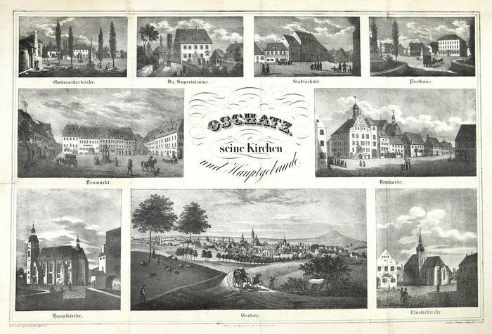 "Oschatz, seine Kirchen und Hauptgebäude". Souvenirblatt. Gesamtansicht von Oschatz, umgeben von 8 Detailansichten. Lithographie von Renner & Ketzschau nach Julius Möckel. Bei Hermann Schmidt in Dresden, (1840). _. * Darstellung 36 x 54 cm. Blattgröße 40,5 x 57,5 cm. (021). *** Thieme-Becker XXIV, 608. - Prämienblatt aus Sachsens Kirchen-Galerie nach einer Vorlage des Dresdner Landschaftszeichners Julius Möckel (1801-1863). - Längs- und Querfalten geglättet, einige professionell hinterlegte Einrisse. Nur minimal fleckig.