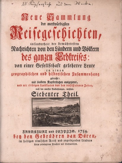 Homers Eroberung des trojanischen Reichs. Privates Album mit 26 Kupferstichen aus: Neue Sammlung der merkwürdigsten Reisegeschichten ... des ganzen Erdkreises: von einer Gesellschaft gelehrter Leute... Siebenter Theil. Frankfurt und Leipzig, Gebrüder van Düren, 1754. 1Titel in Rot- und Schwarzdruck mit Titelkupfer, 1 Bl. mit montierter Titelzeile, 1 Bl. "Erklärung der Vorstellung der Stadt Troja u. ihrer Gegenden", 26 Kupferstiche mit verso montierten Bildtiteln. // Angebunden: 1 Bl. mit 19 montierten Kpfrn. "zu La Motte Fouqué's Undine", 3 Bl. (blanco) mit Paginierung von alter Hd. 4to. 26,5 cm. In schlichtem Interimsumschlag ( dieser gerändert m. kurzen Einrissen). Außentitel: "VI. 25 Kupferstiche zu Homer's Eroberung des trojanischen Reichs". - Mappe (Scrapbook) eines Sammlers des frühen 19. Jahrhunderts mit dessen handschriftl. Bezeichnungen in schwarzer Tinte auf Umschlag u. Titel sowie am Kopf der Fouqué-Kupfer. Anders als vom Sammler hs. angegeben, enth. die Slg. 26 (statt 25) Kupferstiche, die zudem in einer von der "Nachricht für den Buchbinder" abweichenden Folge angelegt sind. Das vollständige, von Goethes Großonkel Johann Michael von Loen (1694-1776) in Fortsetzungen herausgegebene Werk bestand aus 35 Teilen, die von 1749 - 1771 (?) erschienen. - Vgl. VD18 90293126. - Die außerhalb der Heftung angefügten Bögen, "9 Kupferstiche zu La Motte Fouqué's Undine. Gez. von L. F. Schulze. 1825" im Papierformat von 8,2 x 5,8 cm, stehen in keinem Zusammenhang. - Das feste Papier teils braun-, teils stockfleckig, Titel auch sporfleckig; vereinzelt kl. Nässespuren. Die in Bordüren gefassten Stiche in scharfen, kräftigen Abzügen.
