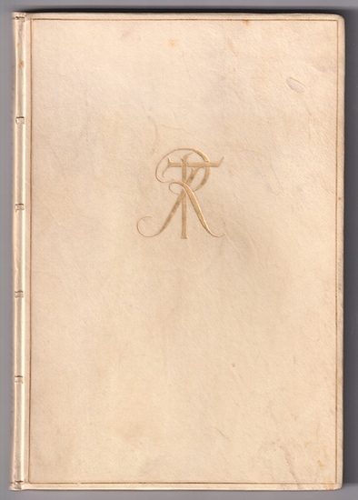Chitra. Ein Spiel in einem Aufzug. Lpz., Kurt Wolff 1914. gr.-8°. 79 S. OPgmt.-Bd. mit goldgepr. Deckelinitialen, Kopfgoldschn., 6 offene durchgezogene Bünde. Minim. Bereibungen. Einbandzeichnung von Walter Tiemann. Einhundert Exemplare wurden zweifarbig auf Kaiserl. Japan gedruckt, in Ganzleder [sic] gebunden und handschriftlich numeriert. Dieses Exemplar trägt die Nummer 28.