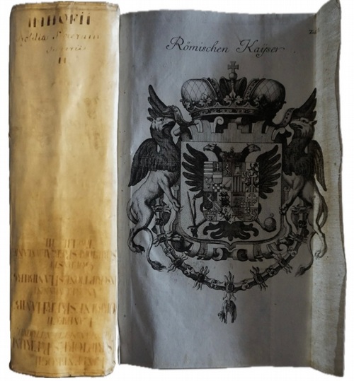 Jacobi Wilhelmi Imhofii Notitiae Sacri Romani Germanici Imperii Procerum. Tomus II. Tübingen: Johann Georg Cotta. 1734. Mit 19 gefalt. heraldischen Kupfertafeln. 241 S. u. Index. Quart. Einband geringf. gebräunt, innen sehr schönes und sauberes Exemplar (nur Band II). beigebunden (teils mit handschriftlichen Zwischentiteln bzw. Blättern.): 1: Abtruck deren vor Ihro Römisch-Kayserlich- und Königlich-Catholischen Majestät Preyszlichstem Reichs-Hoffrath Wider Ihre Churfürstl. Durchl. zu Pfaltz Als Hertzogen zu Gülich und Berg u. In Appelations-Sachen Gülich- und Bergischer Landständen Pro und Contra Gepflogener Handlungen. Cölln: Steinhauss, 1721. 132, 152, 172 S. 2: Weber, Immanuel: Responsum ex Principiis maximè Iuris Gentium Naturalis, In Causa ... Dn. Mariæ Gertrutæ, S. R. Imperii Principis De Berlebs, ... Contra Præpotentes Dominos Ordines Generales Foederati Belgii. Giessen: Muller (1709). 21 S. 3: Vindiciae Juris Reformandi Der Saynischen Landes-Herrschafften, Oder Kurtzer und Gründlicher Beweiß, Daß Dieselbe das vormahls von weiland Graf Wilhelm von Wittgenstein Durch unzuläßige Gewalt abgeschaffte Evangelisch-Lutherische Religions-Exercitium mit allem Recht wieder eingheführet, ... Anno 1719.106 S. 4: Antivindiciae quibus ecclesiae reformatae comitatus Saynensis a practenso jure reformandi liberae adseruntur oder gründlicher Gegen-Beweiß, daß die Lutherische Herrschafften der Graffschafft Sayn uber ihre Untethanen reformierter Religion das Jus Reformandi zu exerciren nicht befugt. 1720. 192 S.