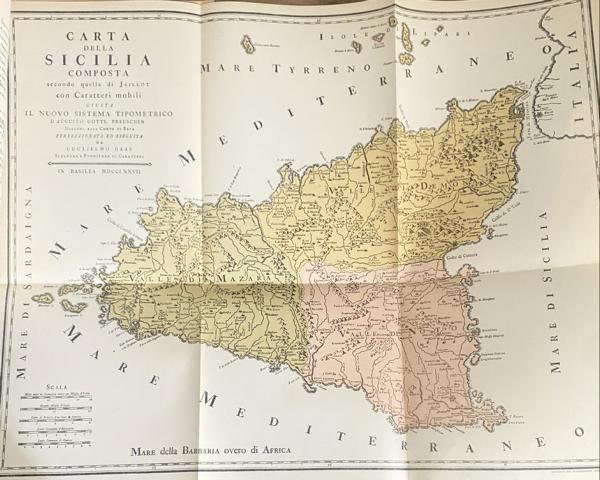 Die Haas` schen Landkarten. Manuldruck. Mit 1 gefalt. farb. Karte von Sicilien. Bern, 1921. 20 S 4°, Original Karton. Eines von 200 nummerierten Exemplaren.- Gutes Exemplar. PA1.