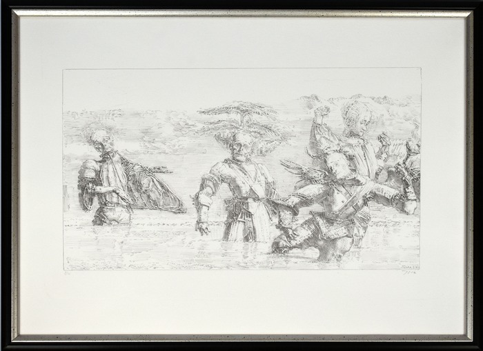 Kindheitserinnerungen. [19]89. [Signierte Original-Lithografie, gerahmt / signed original lithograph, framed]. _. (Werner Tübke, geboren am 30. Juli 1929 in Schönebeck (Elbe), gestorben am 27. Mai 2004 in Leipzig. Deutscher Maler und Graphiker und einer der bedeutendsten Maler der DDR, gehörte mit Bernhard Heisig, Wolfgang Mattheuer und Heinz Zander zur sogenannten Leipziger Schule). Nummer 9 von 75 nummerierten Original-Kreidelithografien auf Büttenpapier. Unterhalb der Abbildung von Werner Tübke in Blei signiert. Druck durch E. Hanke, Ringgenberg/Schweiz. Werkverzeichnis Nr. 171b. Professionell im teils vergoldeten Holzrahmen hinter Glas gerahmt. Nicht ausgerahmt. Maße Rahmen: 43,0 x 56,0 cm. Maße Blatt: 39,5 x 53,5 cm. Maße Abbildung: 24,5 x 41,8 cm. Sehr gutes Exemplar. Number 9 of 75 numbered original chalk lithographs on laid paper. Signed in lead by Werner Tübke below the image. Printed by E. Hanke, Ringgenberg/Switzerland. Catalog raisonné no. 171b. Professionally framed behind glass in a partially gilded wooden frame. Not examined out of frame. Frame dimensions: 43.0 x 56.0 cm. Sheet dimensions: 39.5 x 53.5 cm. Image dimensions: 24.5 x 41.8 cm. Very good copy.