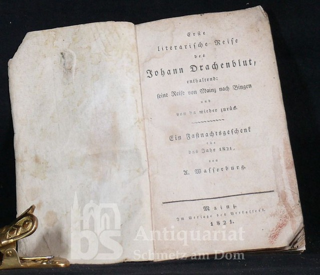 Erste literarische Reise des Johann Drachenblut enthaltend: seine Reise von Mainz nach Bingen und von da wieder zurück. Ein Fastnachtgeschenk für das Jahr 1821. Mainz, im Verlage des Verfassers 1821. 8°. 43 S. Interims-Broschur. Umschlag etwas lädiert. Knickspuren. Hs. Besitzvermerk(?). Geringf. fleckig. Kosch DLL³ XXVIII.363. Goed. VII.575.10 und Meusel/Hamberger XXI.364 (beide letztgenannten ohne den vorlieg. Titel). - Offenbar selten. Im KVK nur ein Bibliotheks-Nachweis (Mainz).