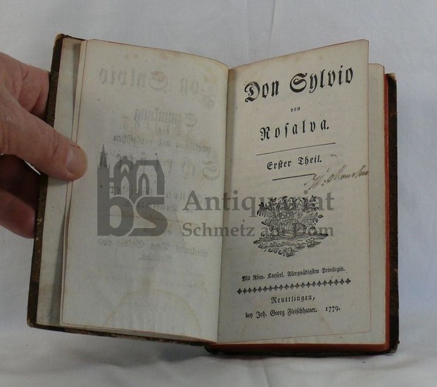 Don Sylvio von Rosalva. Erster (und Zweyter) Theil. Reutlingen, Fleischhauer 1779. 2 Bände. 2 Bll., VIII, 346 S.; 2 Bll., 329 S. HLdr der Zt mit Rückentitel und Rückenvergoldung. Einbände etwas restauriert. Etwas berieben, teils leicht gebräunt. Rückenschilder teils abgeblättert. Das letzte Bl., hinterer Vorsatz und hinterer Spiegel des 2. Bandes etwas sporfleckig. Namen an Vorsatz und Titel. Schwacher Wasserrand. (=Sammlung der poetischen und prosaischen Schriften der schönen Geister in Deutschland. Enthaltend Wielands Don Sylvio von Rosalva). Vorliegende Ausgabe nicht bei Goed. IV.1.551.51. Günther/Zeilinger 520 (nur Ausgabe Reutlingen, Fleischhauer 1781, auch mit vorliegender Paginierung).