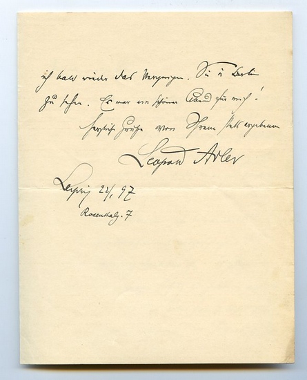 An eine Dame: ?Die Skizzen u. Erzählungen von F. Gröger las ich in einem kleinen Kreis vor, alles war entzückt. Ein starkes Talent! Schade, daß die Dinge frivol sind, sonst möchte ich sie zu einer öffentlichen Vorlesung wählen; so darf ich es nicht, da mich die Leipziger sonst mit dem Bannstrahl belegen würden. ? Da Sie in der modernen Litteratur sehr bewandert sind, bitte ich Sie, mir verschiedenes vorzuschlagen, das für eine Vorlesung dankbar ist [...]?. ? Leopold Adler erhielt Schauspielunterricht von Roderich Anschütz und Alexander Strakosch, debütierte in der Rolle des Friedrich Schiller in ?Karlsschüler? am Theater in Karlsbad und war dann an mehreren kleinen Bühnen in Sachsen beschäftigt. ?1889 wurde er Regisseur am Stadttheater in Riga, war seit 1892 Oberregisseur am Breslauer Stadttheater, seit 1894 am Berliner Schillertheater und von 1896 an am Stadttheater Leipzig. Seine Berufung als Dramaturg und Regisseur in den Verband der Königlichen Schauspiele Berlin erfolgte 1902. 1909 wurde er als Direktor des Hoftheaters nach Braunschweig berufen. Adler schrieb u. a. das Schauspiel ?Das Buch Hiob? (1891)? (DBE).